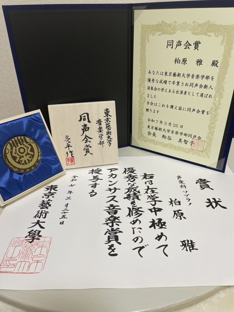 この度、東京藝術大学音楽学部声楽科を卒業いたしました。在学中は多くの素晴らしい先生方や仲間との出会いに恵まれ、学びと成長の日々を重ねることができました。卒業にあたり、同声会賞、アカンサス音楽賞、佐々木成子賞を賜り、大変光栄に存じます。